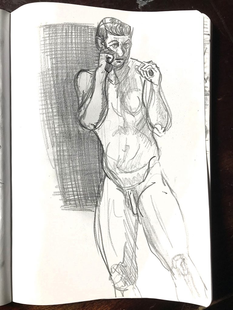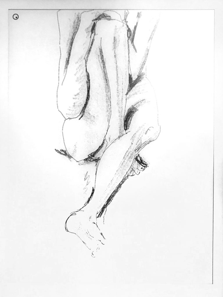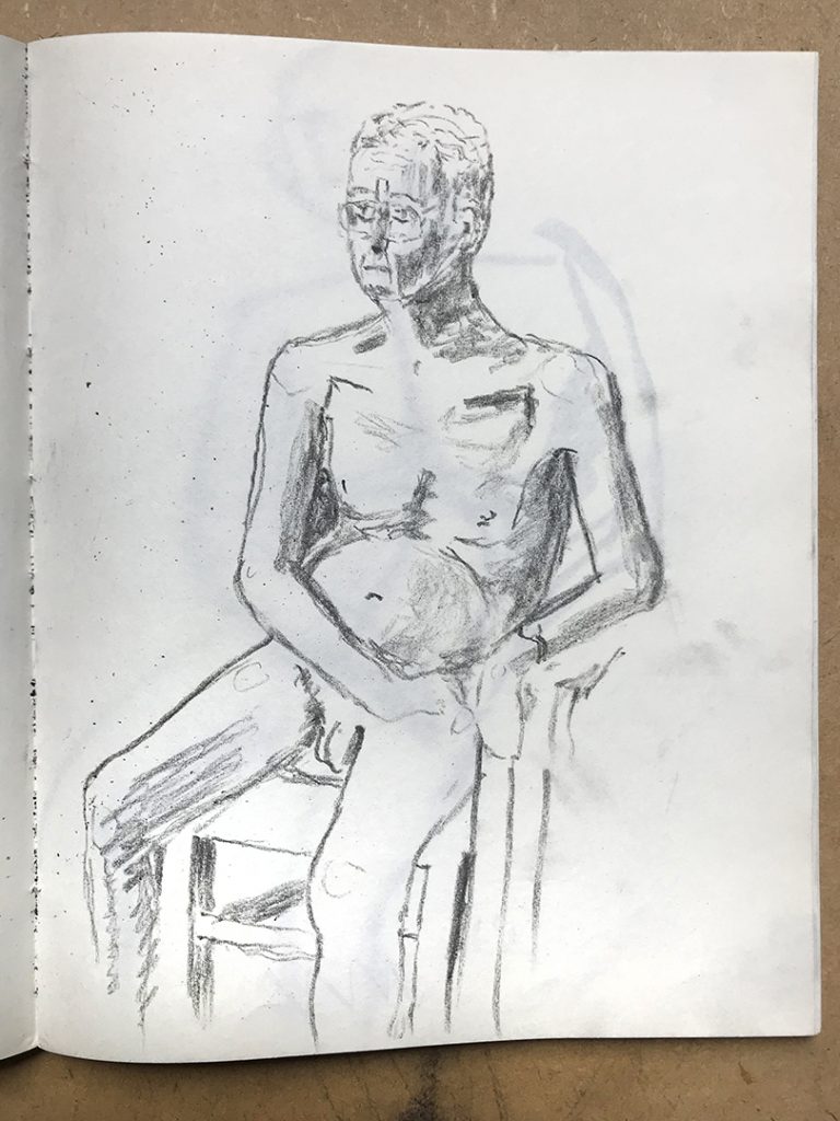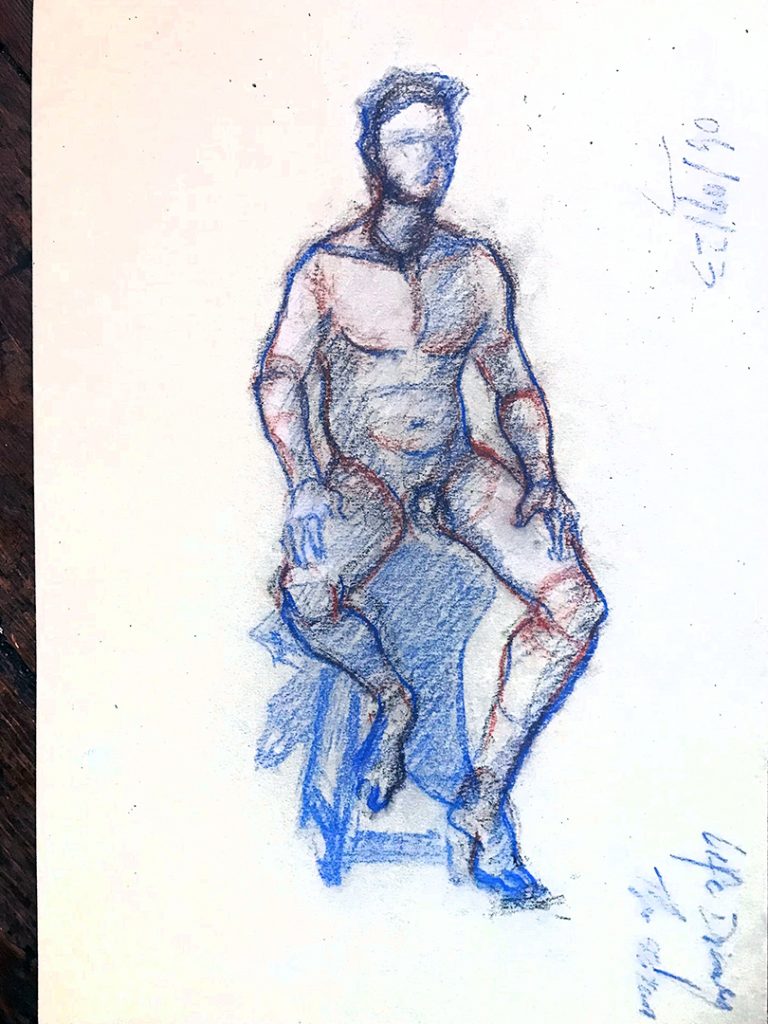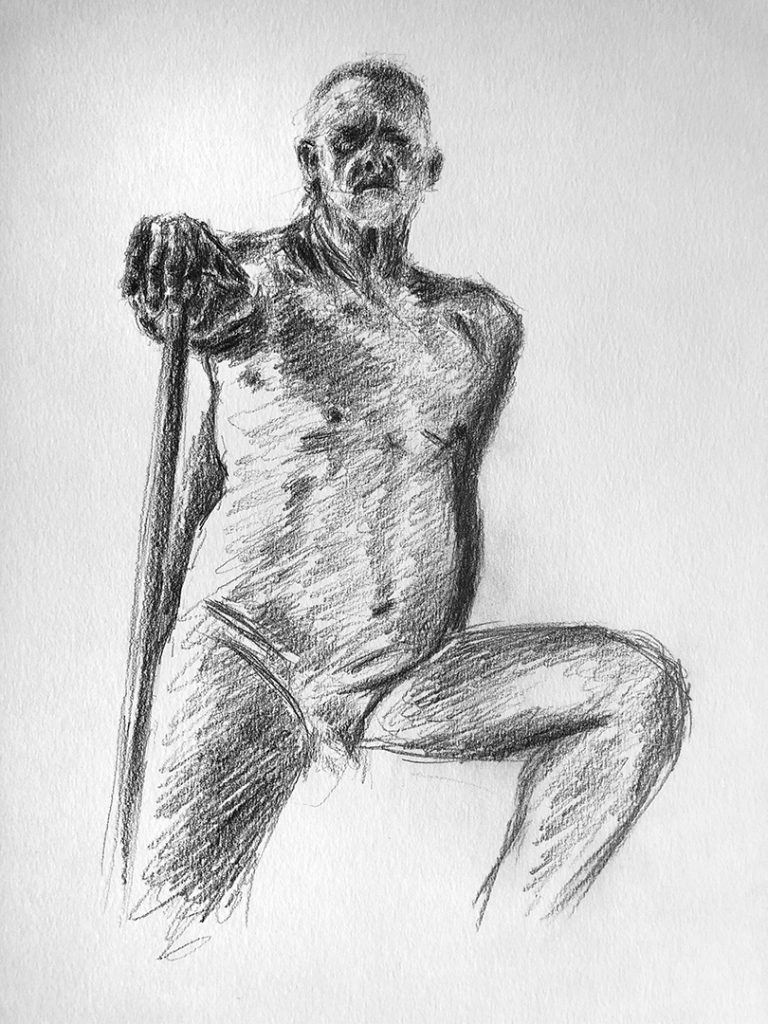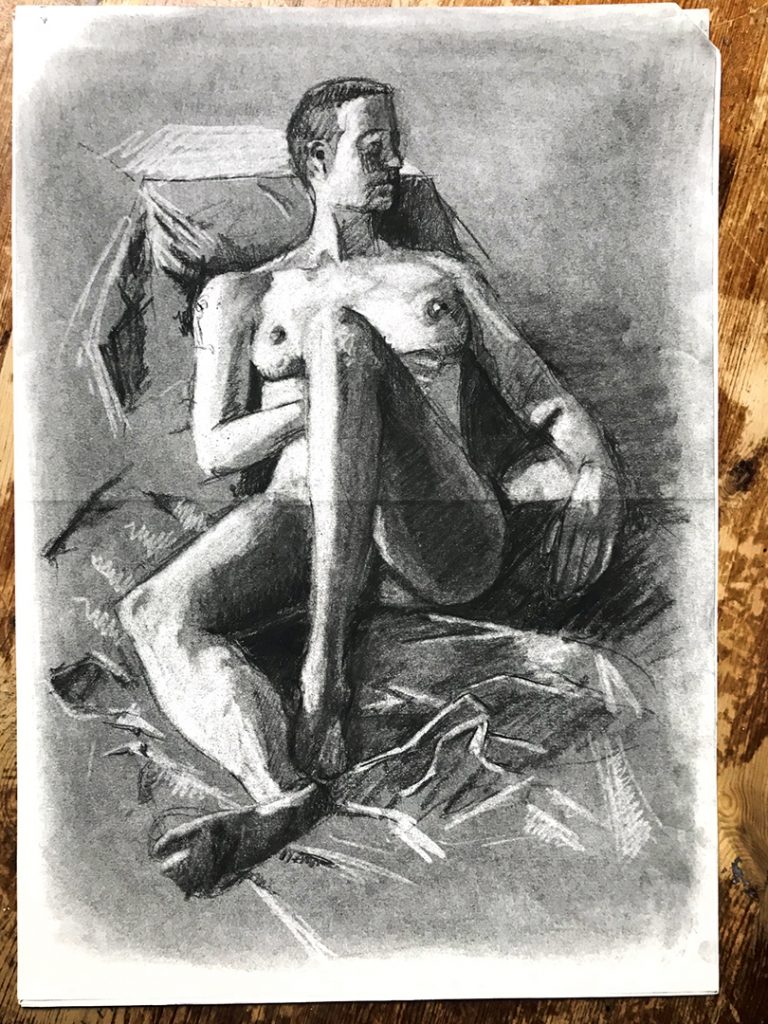 Much enjoyed and energetic session with Paul (modelling) this week who improvised daringly with the furniture to hand. For several of these poses he was up on a table giving a good POV all round. Thanks everyone for coming!…1/2/23