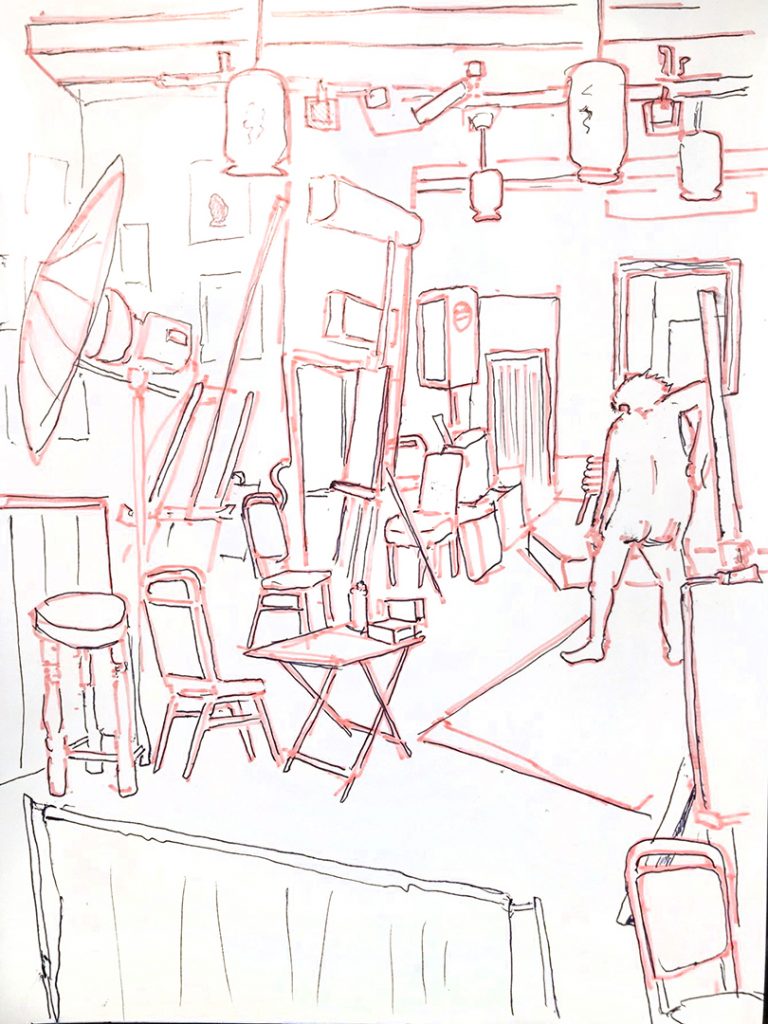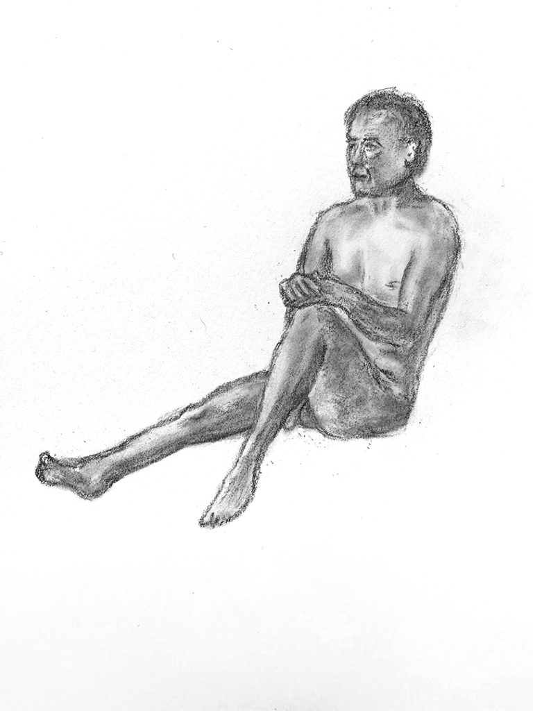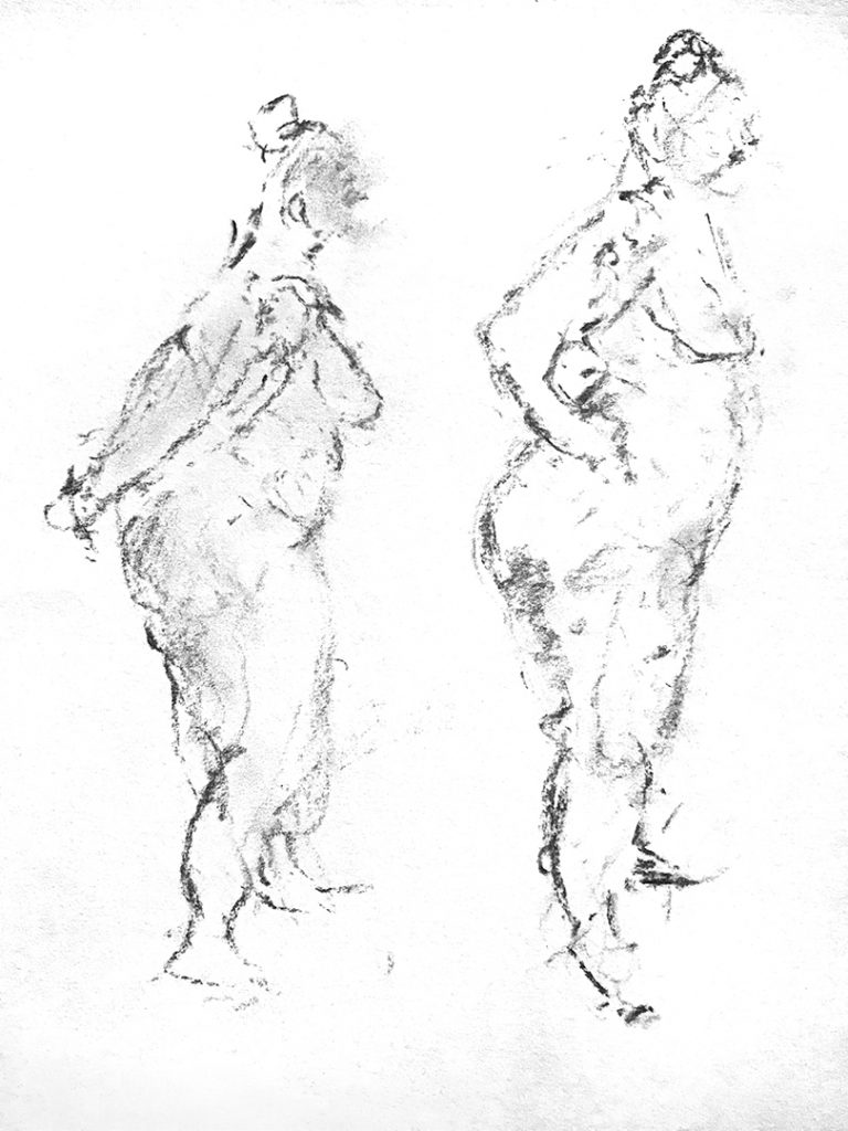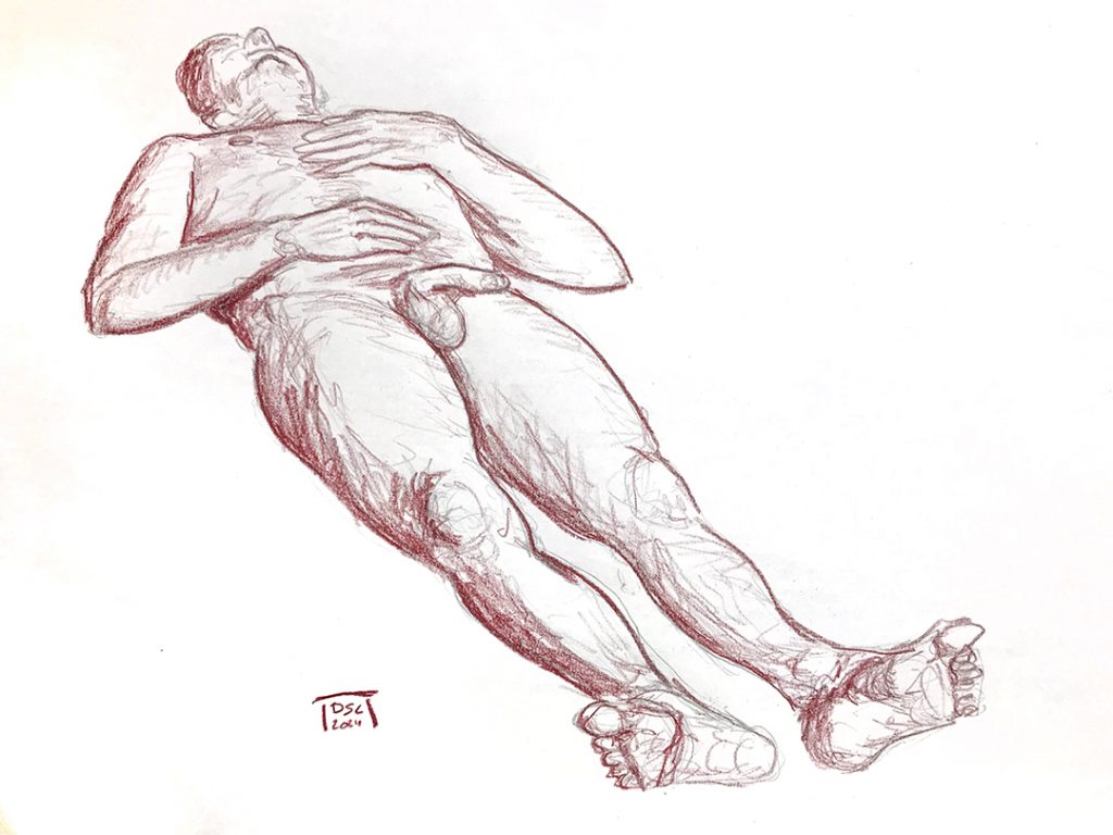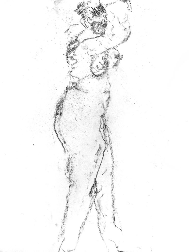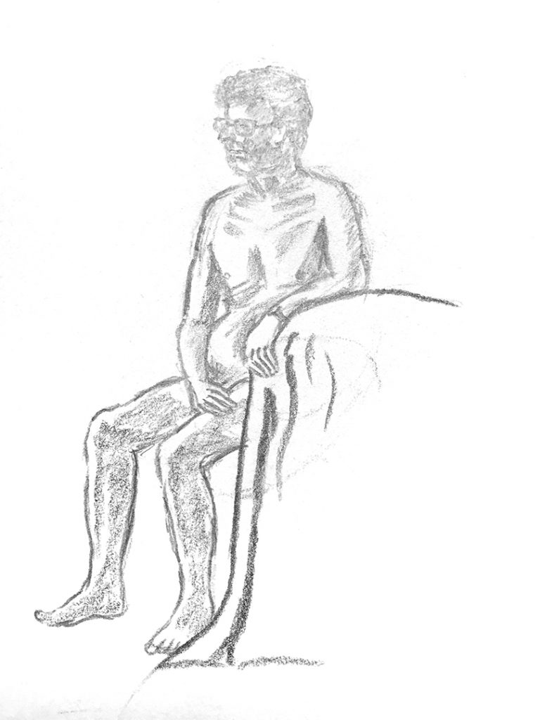 Much enjoyed and energetic session with Paul (modelling) this week who improvised daringly with the furniture to hand. For several of these poses he was up on a table giving a good POV all round. Thanks everyone for coming!…1/2/23