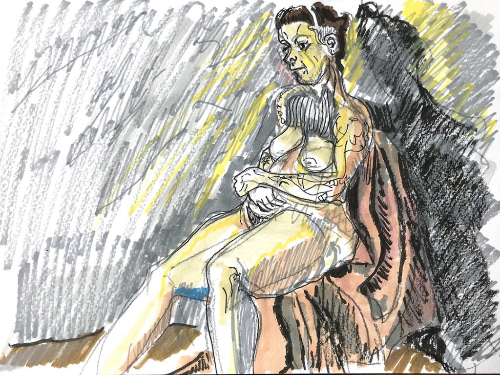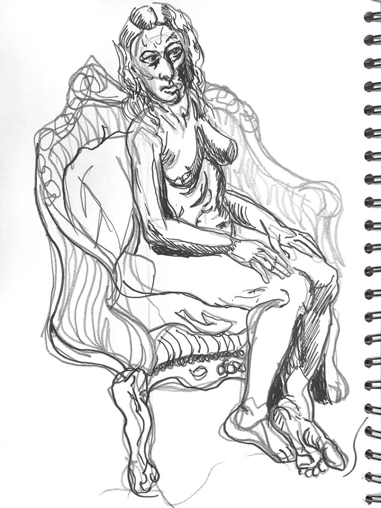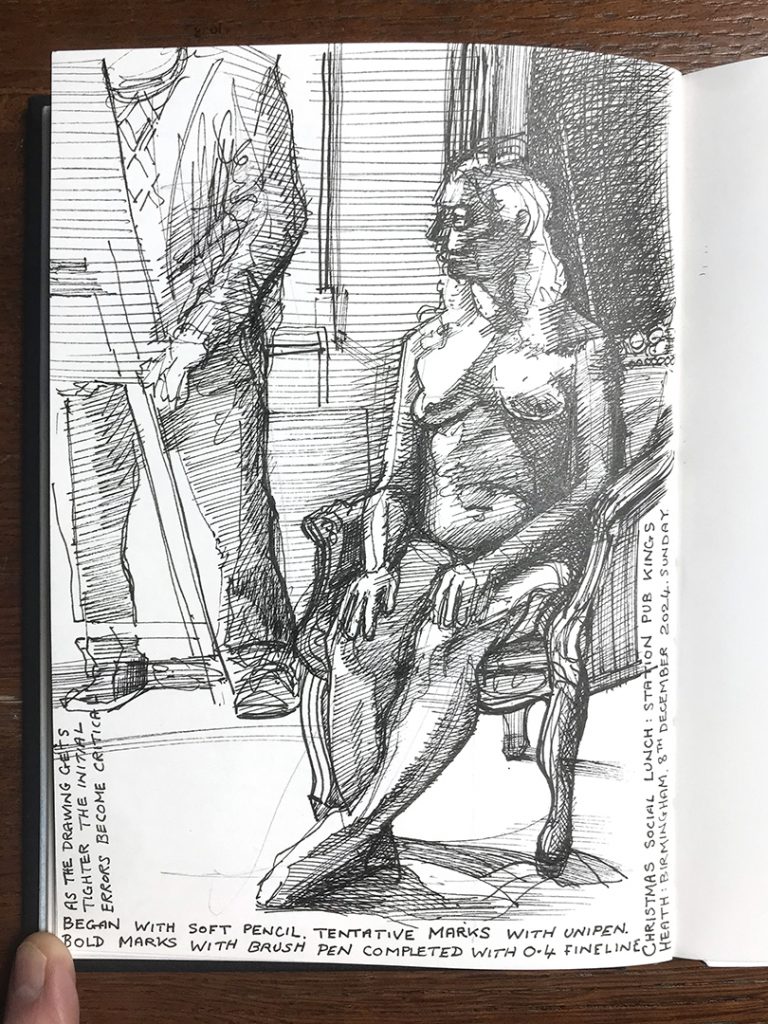 Thanks to everyone who came to a really great session this afternoon. Tamsyn had beautiful poise in the giant and very ornate chair we found for the long pose. The pre-session meal and drinks was a lovely end of year social too. Shout out for the scrumptious nut roast at The Station pub. 08/12/24